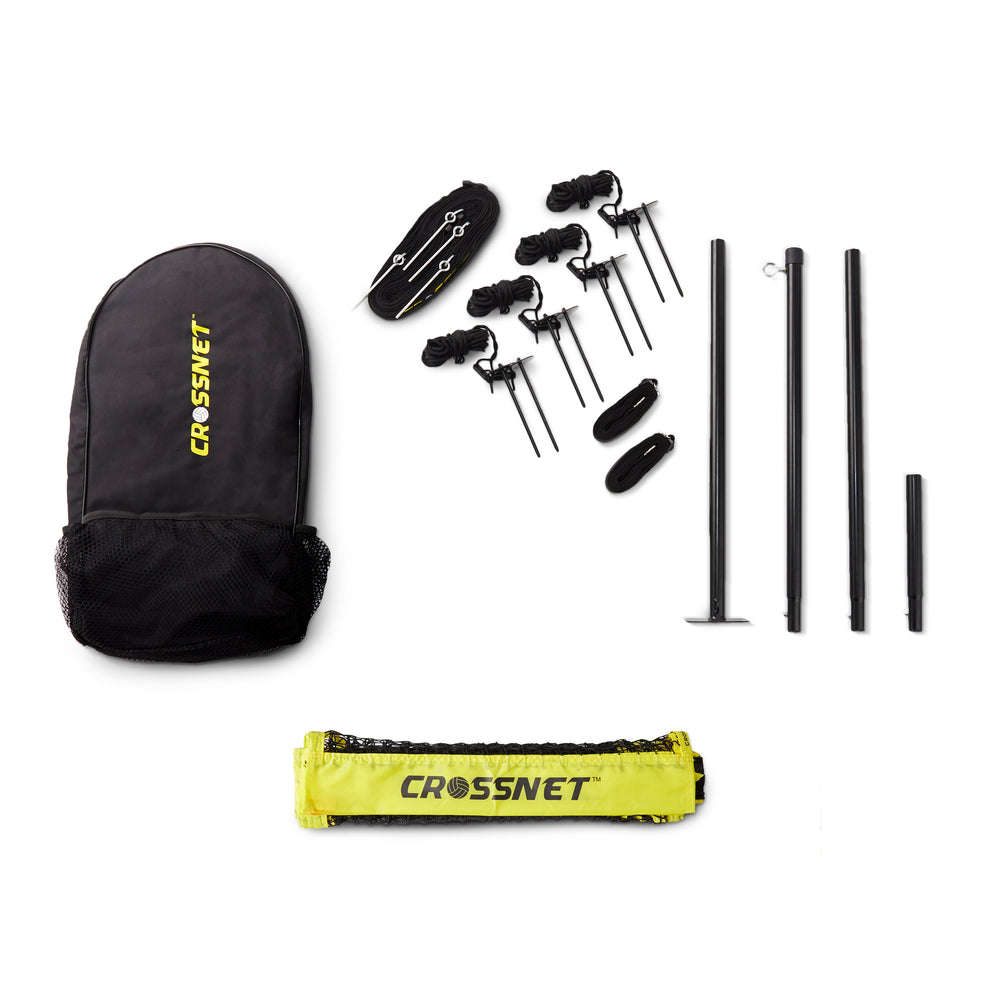 CROSSNET-Set Das Set umfasst folgende Inhalte: 1 x CROSSNET Netz 1 x CROSSNET Tasche 20 x Metallstangen zur Befestigung 12 x Bodenanker 4 x Spannungsschnüre 1 x Äußere Grenzlinien |