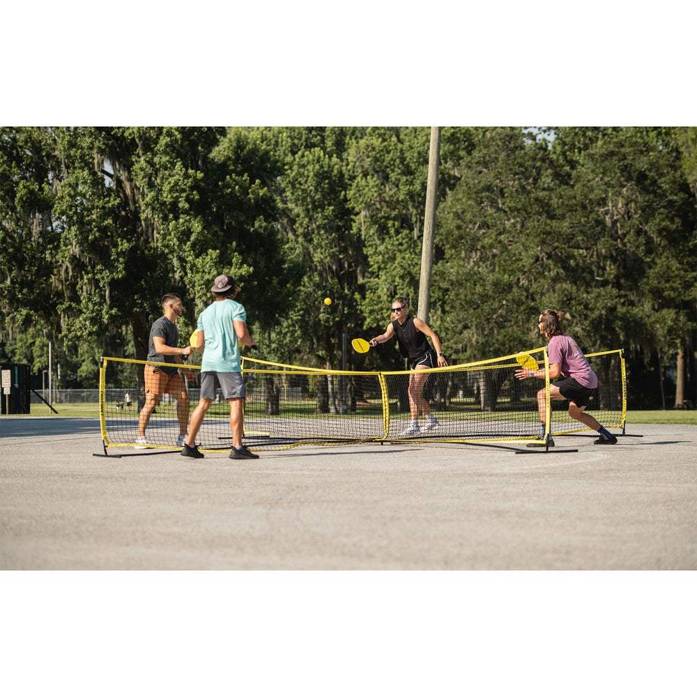 Neu bei der Marke Crossnet ist Crossnet Pickleball. Wie die anderen Crossnet-Spiele ist auch dieses Spiel von Four Square inspiriert. Dieses Mal haben wir uns entschieden, es mit dem beliebten Pickleball zu kombinieren. Pickleball ist eine Kombination aus Tennis, Badminton und Tischtennis. Das Standard-Pickleballfeld ist viel kleiner als ein Tennisfeld und hat ungefähr die gleiche Größe wie ein Badmintonfeld. Der Pickleball-Ball hat die gleiche Größe wie ein Tennisball, ist aber aus Plastik und hat Löcher. Der Pickleball-Schläger wird Paddle genannt und hat, wie ein Tischtennisschläger, keine Saiten. Pickleball ist ein sehr zugängliches Spiel, und Sie können, ohne es jemals gespielt zu haben, sofort ein unterhaltsames Spiel haben. Üben Sie Ihre Rückhand, Ihre Vorhand und Ihre Schläge, während Sie versuchen, Punkte zu sammeln, indem Sie nach den traditionellen Crossnet-Regeln spielen oder eine normale Partie Pickleball spielen. Sie können das Crossnet-Pickleball-Netz nämlich auch ganz einfach in ein Standard-Pickleball-Netz umwandeln, das Netz hat dann die Standardlänge von 6,70 Metern. Das Crossnet Pickleball-Set besteht aus einem Rahmen aus rostfreiem Stahl, einem Pickleball-Netz, 4 Ahorn-Schlägern, 2 Outdoor-Pickleball-Bällen, Regeln und einer Aufbewahrungs-/Reisetasche. Nehmen Sie Ihren Crossnet Pickleball in der praktischen Tasche mit und bauen Sie das Spiel schnell und einfach im Park, im Garten, auf einem Platz oder in der Halle auf.