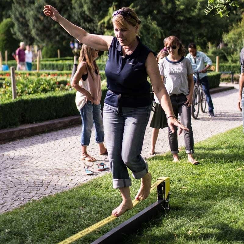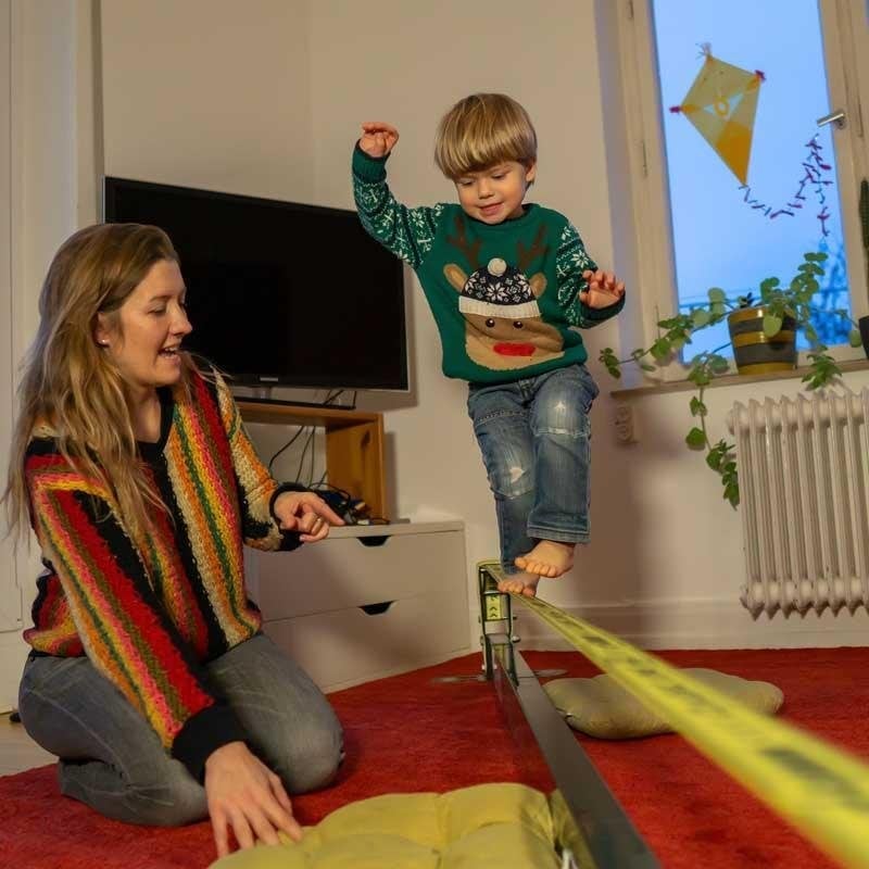 2-3 m langes, freistehendes Slackline Gerüst in niedriger Aufbauhöhe (30 cm), bestückt mit einem 5 cm breiten und 5 m langen Classic Slackline als komplettes Set. (Keine Ankerpunkte nötig!) Aufbaulänge mit Erweiterungsbalken (“Extension Piece”) bis 4 m! Ideal für Balancetraining auf einer niedrigen und sicheren Slackline zu Hause mit der ganzen Familie oder für den professionellen Einsatz zur Rehabilitation von Verletzungen und zur Leistungssteigerung im Alltag und Sport. Designed in Germany!